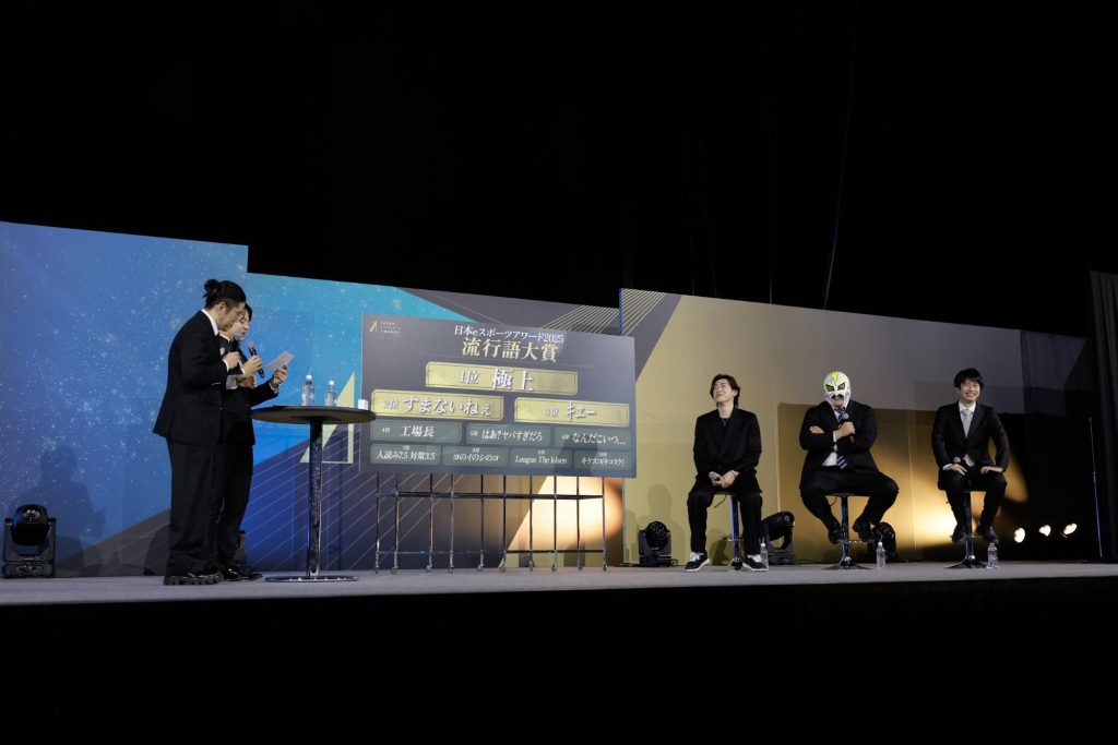 2025年のeスポーツ界を象徴する「日本eスポーツアワード 流行語大賞」では、最終候補に残った30個の流行語からTOP10を発表。栄えある第一位には、2024年に開催されたゲームイベントでのClutch_Fi氏の発言から生まれた「極上」が選ばれました。この日Clutch_Fi氏はファン太氏、ハイタニ氏とともに流行語大賞発表のゲストとしてステージに登壇しており、驚きと喜びで会場は大いに盛り上がりました。